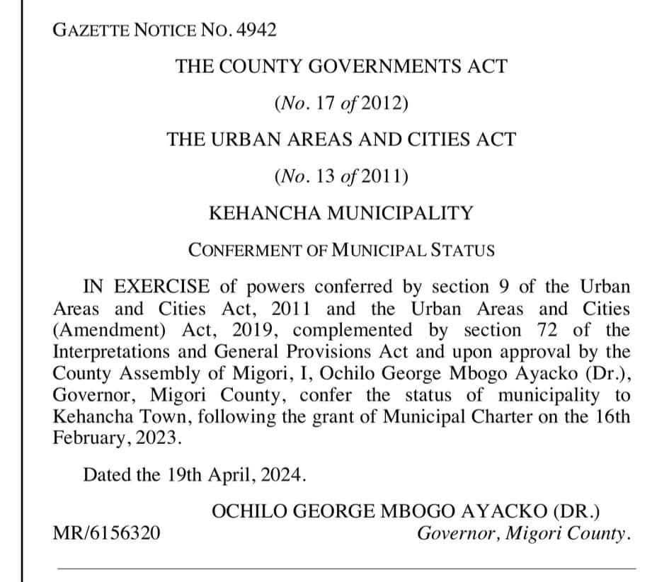 Kehancha Municipality Gazette Notice